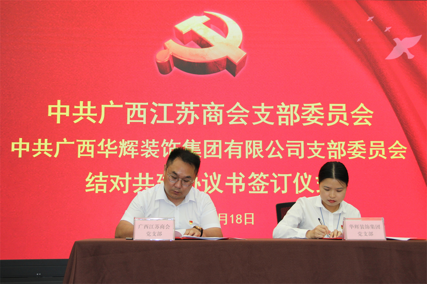 签约仪式上,商会党支部书记王伟、Ky开元集团装饰集团党支部书记刘萍东签订了结对共建协议,并由王伟同志代表广西江苏商会党支部向广西Ky开元集团装饰集团有限公司党支部赠牌。