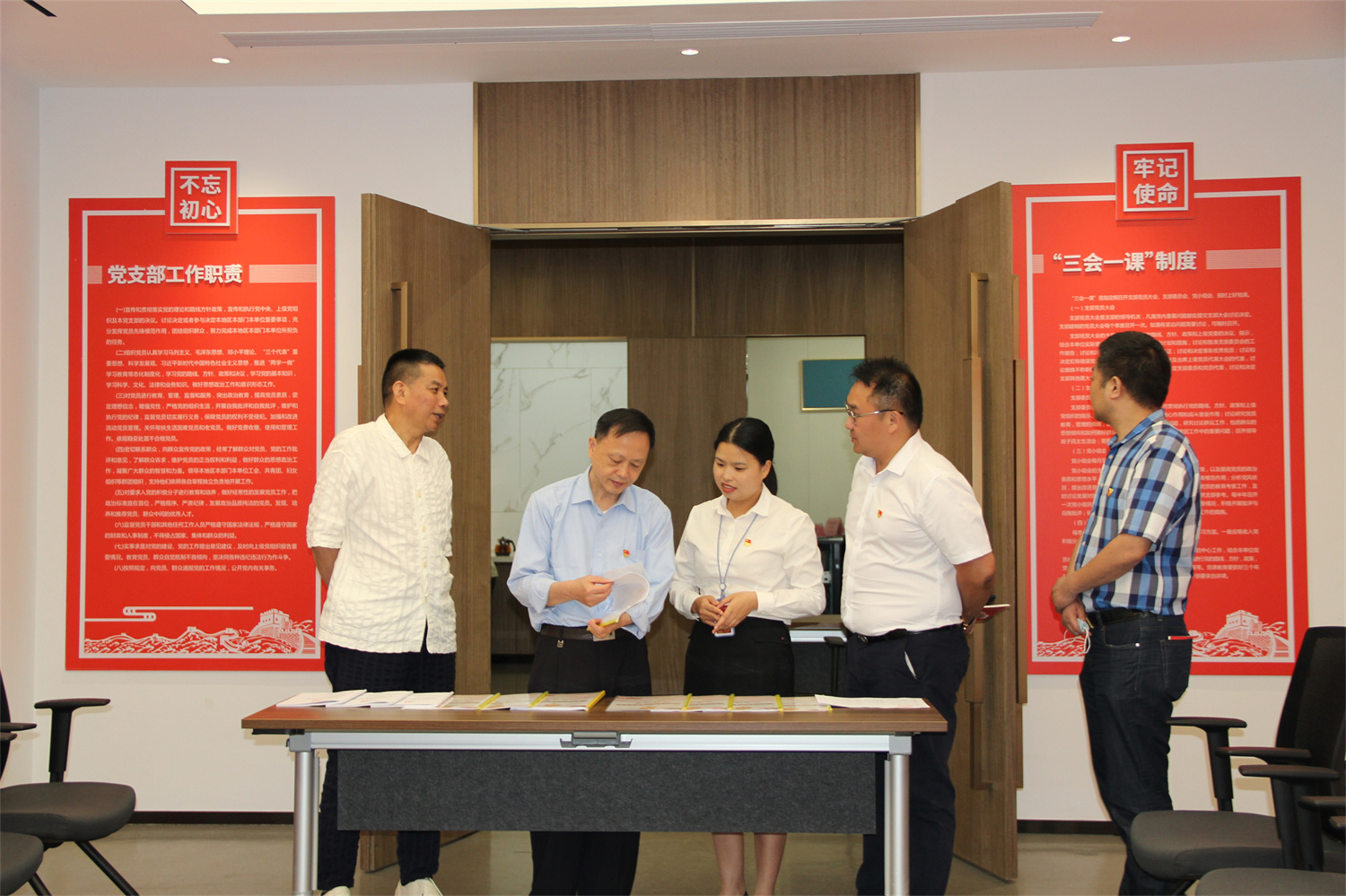 ▲李开刚(左二)查看Ky开元集团党支部党建工作台账