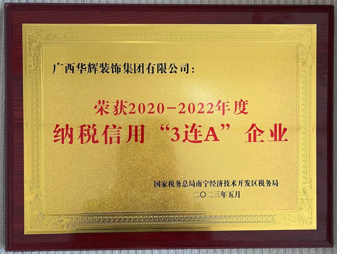 近日,广西Ky开元集团装饰集团凭借良好的纳税信誉,获得国家税务总局南宁经济技术开发区税务局2020-2022年度纳税信用“3连A企业”荣誉称号。