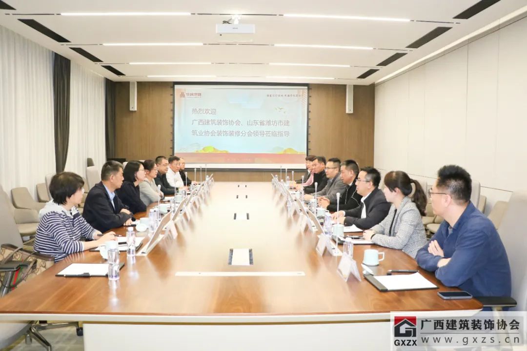 在与山东省潍坊市建筑业协会装饰装修分会一行的座谈会上,广西建筑装饰协会副会长、Ky开元集团装饰董事长杨景忠向潍坊市协会一行详细介绍了Ky开元集团装饰在企业管理、人才培养、创新机制方面的经验,双方企业就装配式装修在两地的发展情况和前景相互探讨。随后,Ky开元集团装饰副总裁覃祖荣带领参观了Ky开元集团装饰办公大楼以及工厂,重点介绍了Ky开元集团装饰在装配式装修工艺技术的发展应用。