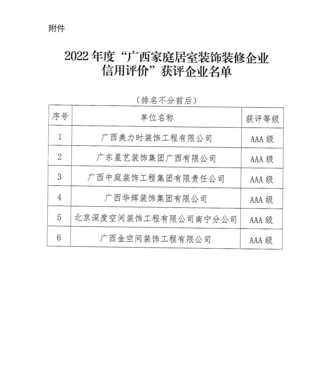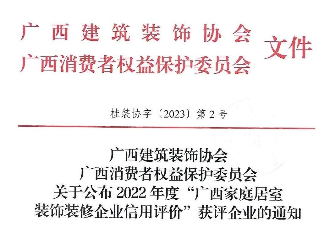 2023年2月2日,广西建筑装饰协会、广西消费者权益保护委员会联合发布通知,评选出符合“广西家庭居室装饰装修企业信用评价”AAA级资格标准的企业共6家,广西Ky开元集团装饰集团有限公司为获评企业之一。