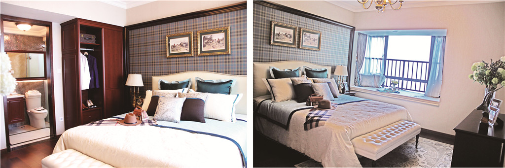 主卧:实木边框装饰出阔绰的背景墙,给人宽阔的视野,欧式格子壁纸搭配独特个性的装饰画,阳光从宽景飘窗飘入,照亮每一个明亮优雅的清晨。