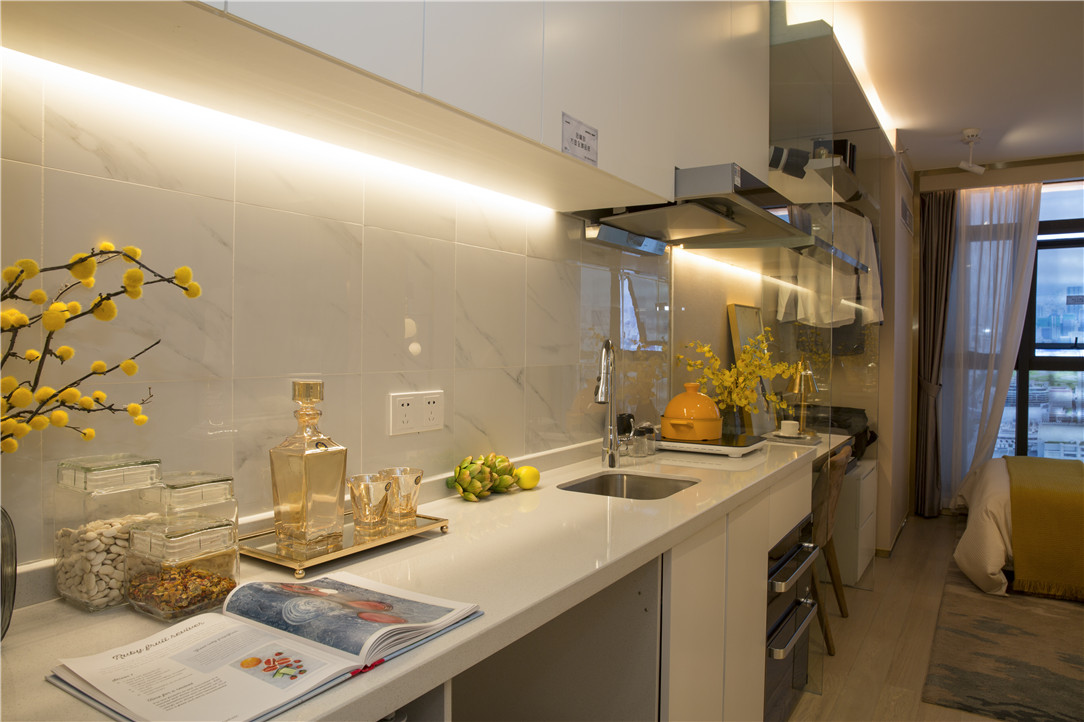 ▲开放式厨房设计,玄关与明厨、小客厅连成一线,一字型橱柜简洁实用,将拥挤杂乱挤出门外,整体视觉上舒适大气。