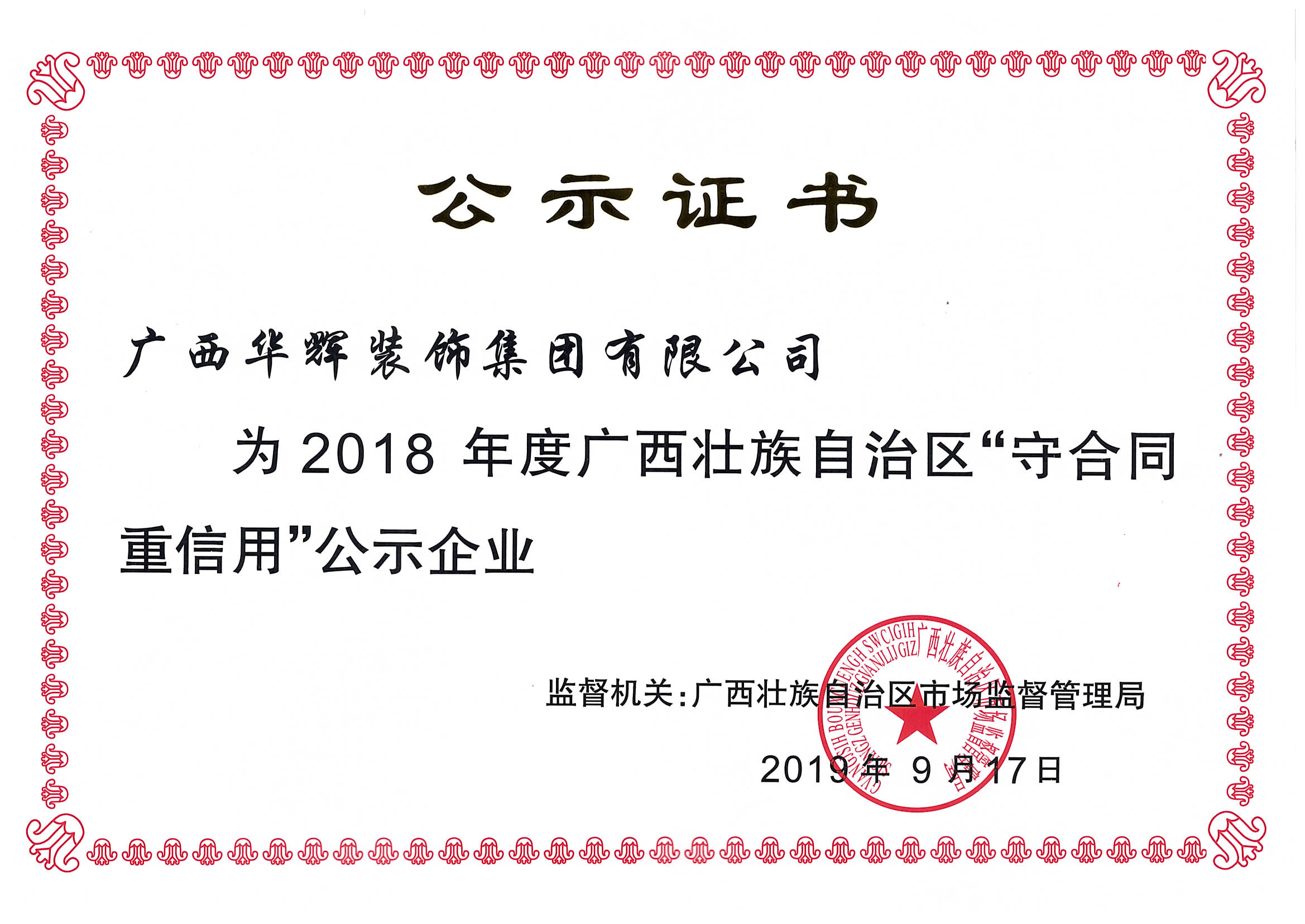 近日,在广西壮族自治区市场监督管理局开展的“守合同重信用”企业评选活动中,Ky开元集团凭借自身良好的信用体系建设、诚信守约形象,荣获2018年度广西壮族自治区“守合同重信用”企业。