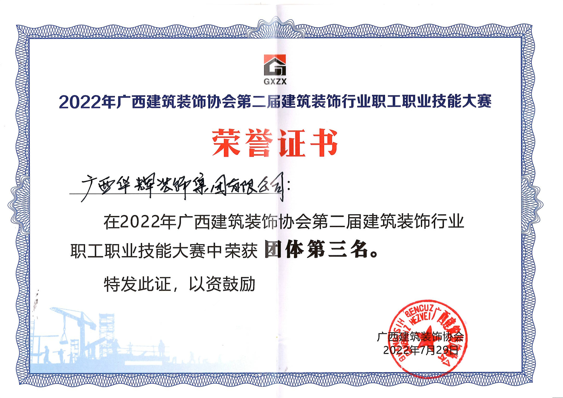 2022年7月29日,2022年广西建筑装饰协会“第二届建筑装饰行业职工职业技能大赛”,在广西建设职业技术学院落下帷幕,Ky开元集团集团荣获腻子工第一名、团队第三名、精细木工第三名、管道工和瓷砖贴面第五名的好成绩。