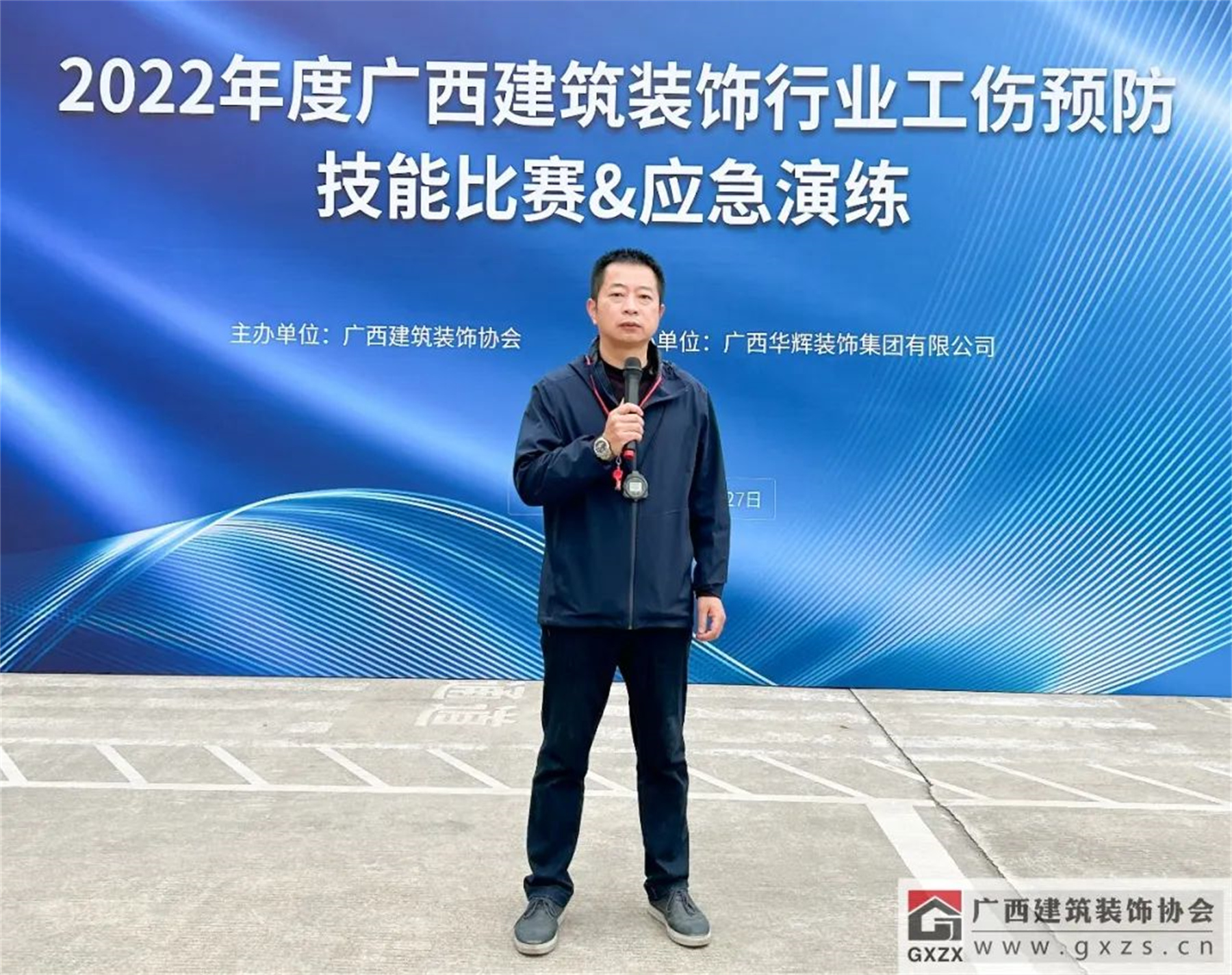 广西建筑装饰协会秘书长、工伤预防特聘讲师谭谦在致辞中表示希望通过举办本次技能比赛及应急演练,提升建筑装饰行业从业人员对特防用品的正确佩戴及使用情况,提高员工自救、救人能力,减少从业人员因突发危机情况而发生伤亡事故;并达到检验从业人员及义务消防应急组织应对火灾的能力,提高员工灭火、疏散、自救能力和管理者火场组织、协调、指挥能力的目的。