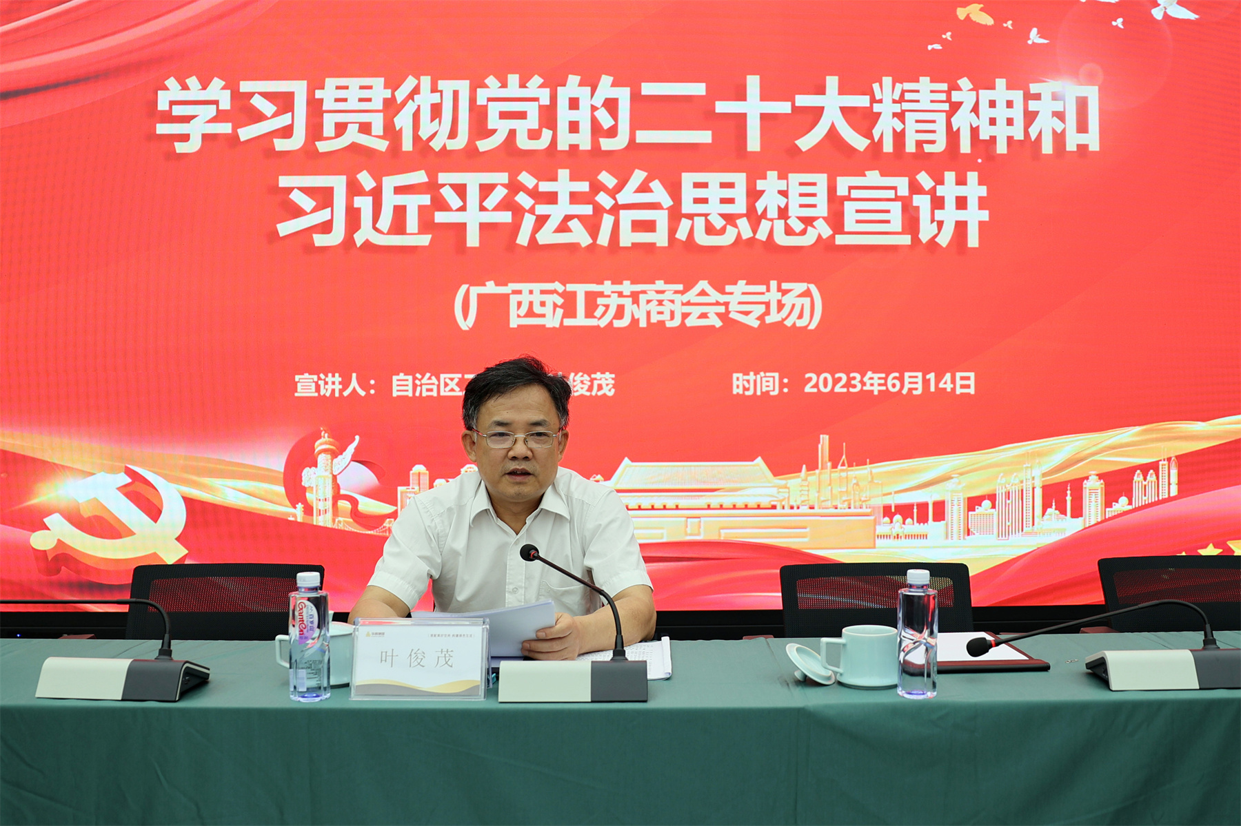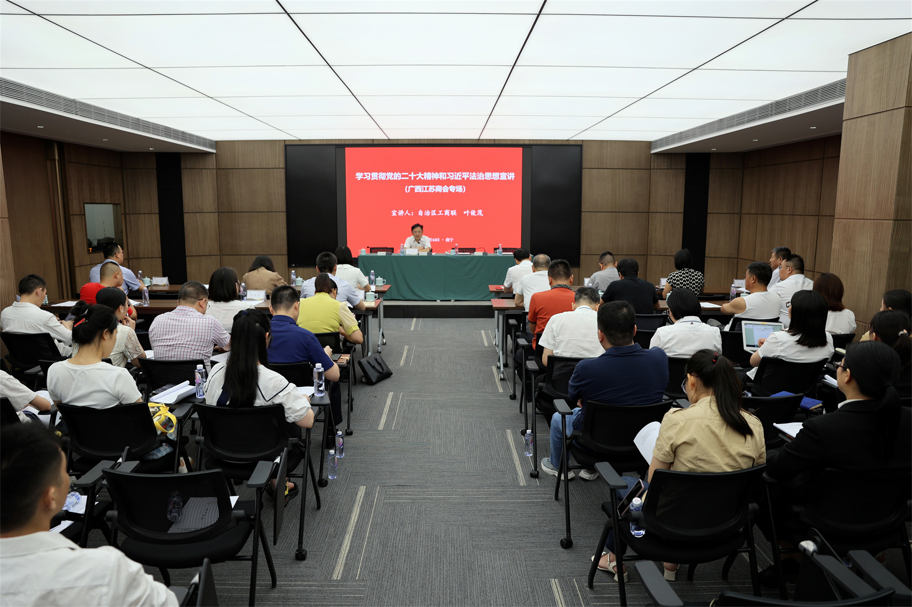 2023年6月14日,自治区工商联2023年“法律进商会”“法律进民营企业”暨防范非法集资宣传活动,在广西Ky开元集团装饰集团举行。自治区工商联副主席叶俊茂出席活动并作学习贯彻党的二十大精神和习近平法治思想宣讲。集团董事长杨景忠率公司管理人员及员工代表参加了活动。
