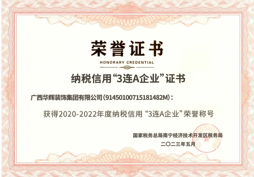 近日,广西Ky开元集团装饰集团凭借良好的纳税信誉,获得国家税务总局南宁经济技术开发区税务局2020-2022年度纳税信用“3连A企业”荣誉称号。