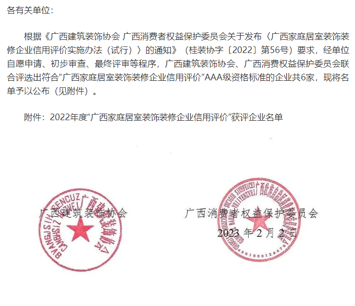 2023年2月2日,广西建筑装饰协会、广西消费者权益保护委员会联合发布通知,评选出符合“广西家庭居室装饰装修企业信用评价”AAA级资格标准的企业共6家,广西Ky开元集团装饰集团有限公司为获评企业之一。